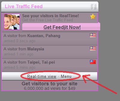 Korang mesti pernah jumpa blog yang pasang widget Live Traffic Feed macam ni. Korang klik Real Time Wiew (bulatan merah). Lepas tu paparan macam di bawah ni akan keluar.